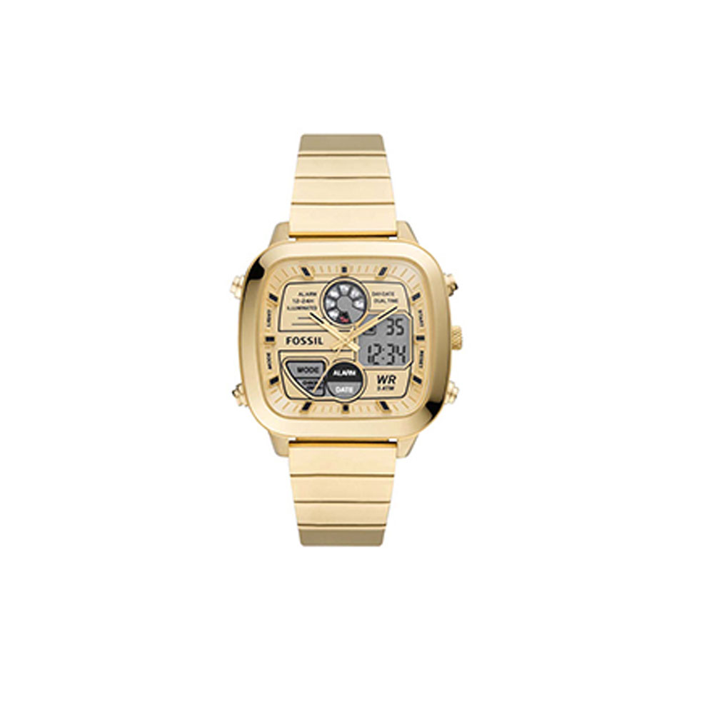 Caixa 100% aço inoxidável dourada; Pulseira 100% inoxidável; mostrador anadigi dourado;