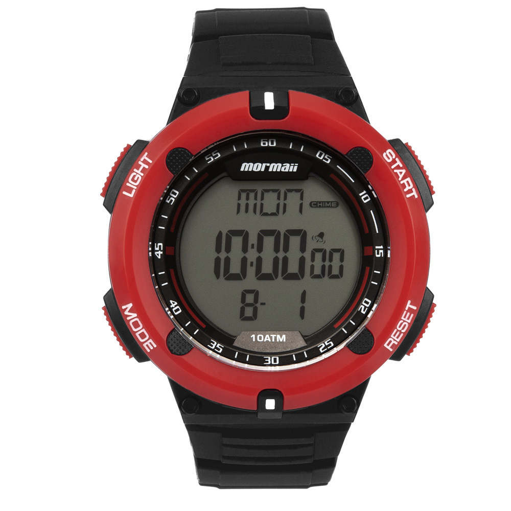 O relógio é resistente à 10 atm, possui caixa de 51mm e mostrador lcd positivo.