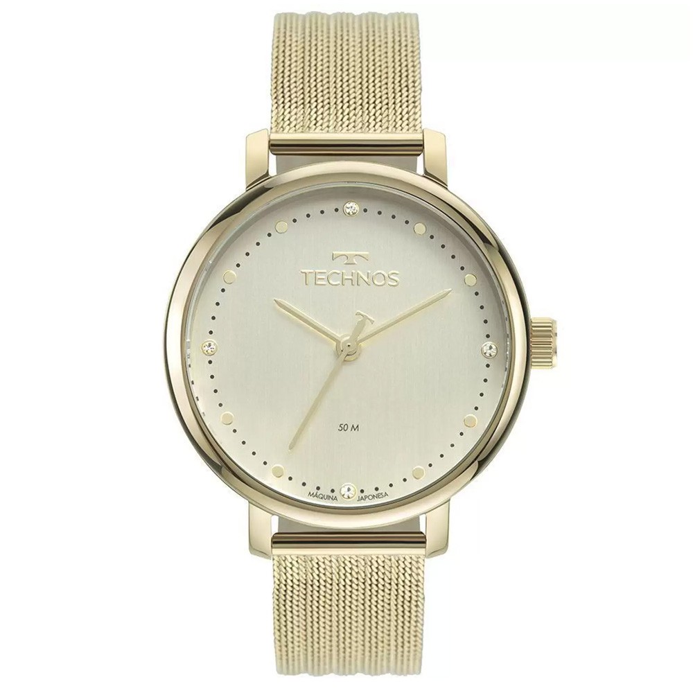 Relógio feminino com sistema analógico com ponteiros indicando as horas, minutos e segundos.