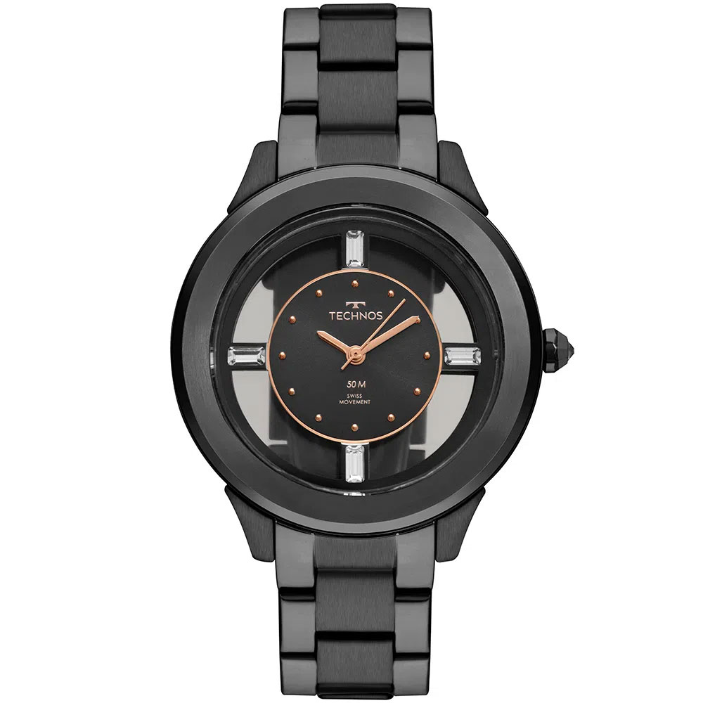Relógio Technos Feminino com caixa e pulseira de aço com banho preto, fundo de vidro transparente com mostrador vazado, cristais Swarovski e maquinismo suíço ETA.