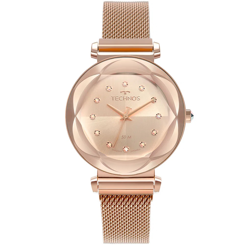 Relógio Technos Crystal feminino redondo, analógico, rosé, com caixa de aço e pulseira mesh com fecho magnético.