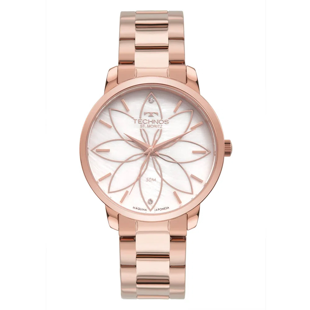 Relógio Technos St. Moritz feminino, com caixa e pulseira de aço inoxidável em banho rosé.
