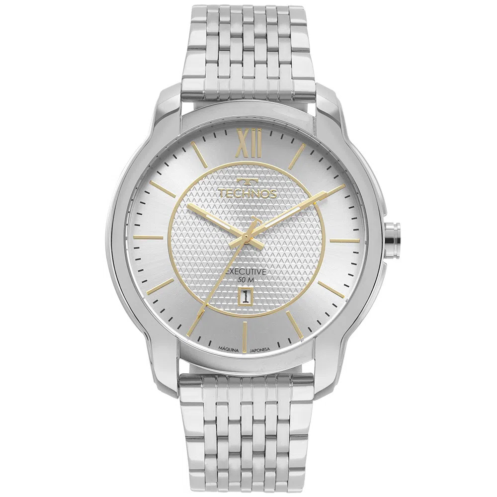 Relógio Technos Executive masculino, com caixa e pulseira de aço diferenciadas em banho prata.